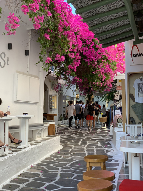 그리고 의외로 카마리비치부근이 더 마음에 들었습니다. 이 마을은 제가 미코노스에 먼저 방문했던 관계로 절벽이 아닌 비치마을로 비슷할 것이라 판단하여 숙박없이 관광만 했습니다. 한층 여유롭고 한적하며 잘 꾸며진 마을이었습니다. 식사비용도 많이 비싸지 않고 그리스하면 떠오르는 핑크빛 흐드러진 꽃 부겐빌레아와 흰벽의 집이 많았습니다.
