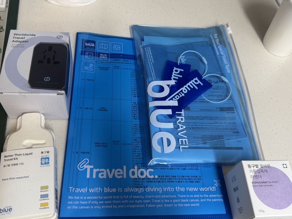 사진은 예약 후 블루여행사에서 챙겨주신 여행 바우처와 입욕제, 러기지 택들이에요!